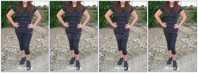 se nota que la foto es photoshop ... a medida que ponen que la chica baja de peso, se ve como en las fotos adelgaza de piernas pero los brazos lo tiene casi iguales que al principio. Además, la camiseta y los pantalones deberían irles grandes, en cambio siempre están ajustados a su cuerpo. Si, puede que sea ropa elástica pero aún así debería quedarle más holgado al perder peso ... Mismo fondo de foto, la posición de los dedos y de las manos en la misma .... A vuestro juicio lo dejo.